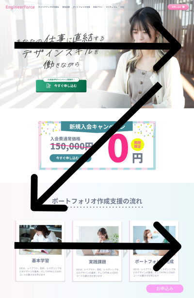・ヘッダー → メインビジュアル → サービス紹介 → CTA(行動ボタン) というように、Z型に沿ったレイアウトは、視線誘導に効果的です。