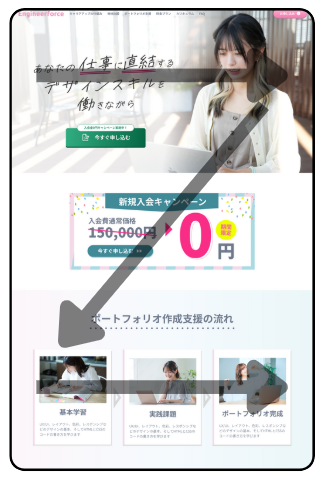 このパターンを意識すると、目立たせたい要素を「Z」の線上」に配置することで、自然にユーザーの目に入る設計が可能になります。たとえば、「キャッチコピー → メインビジュアル → CTA(行動ボタン)」という構成がZ型に当てはまります。